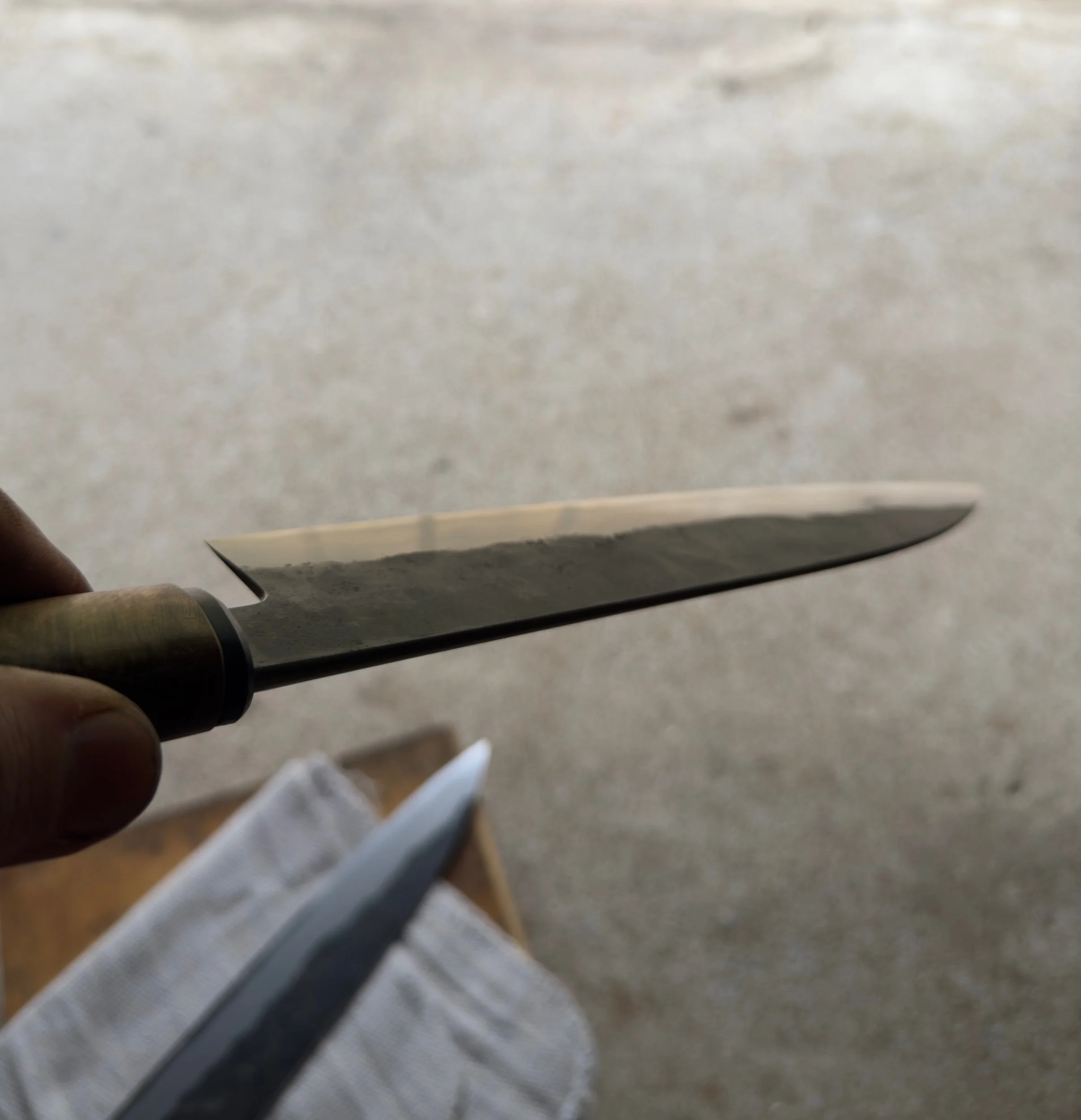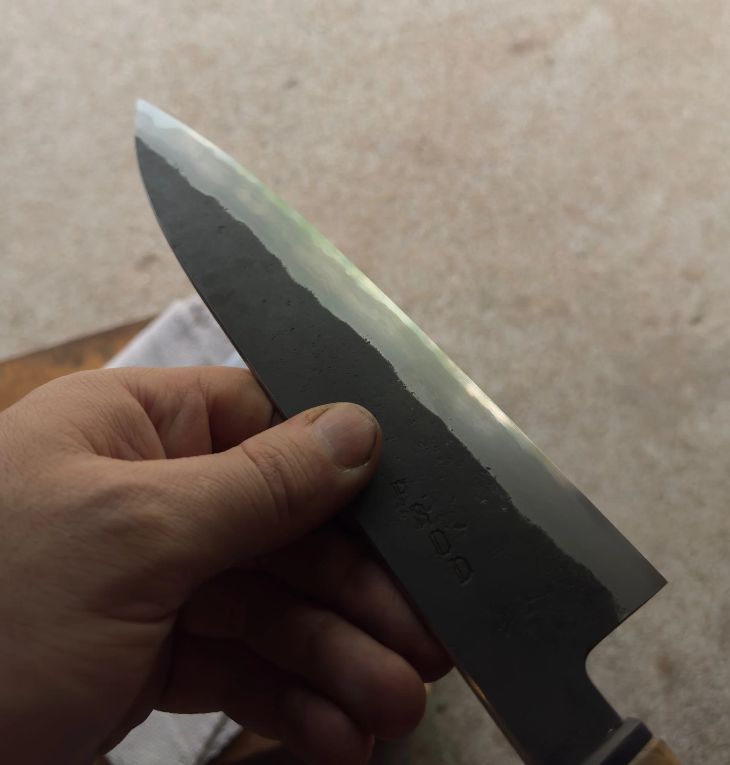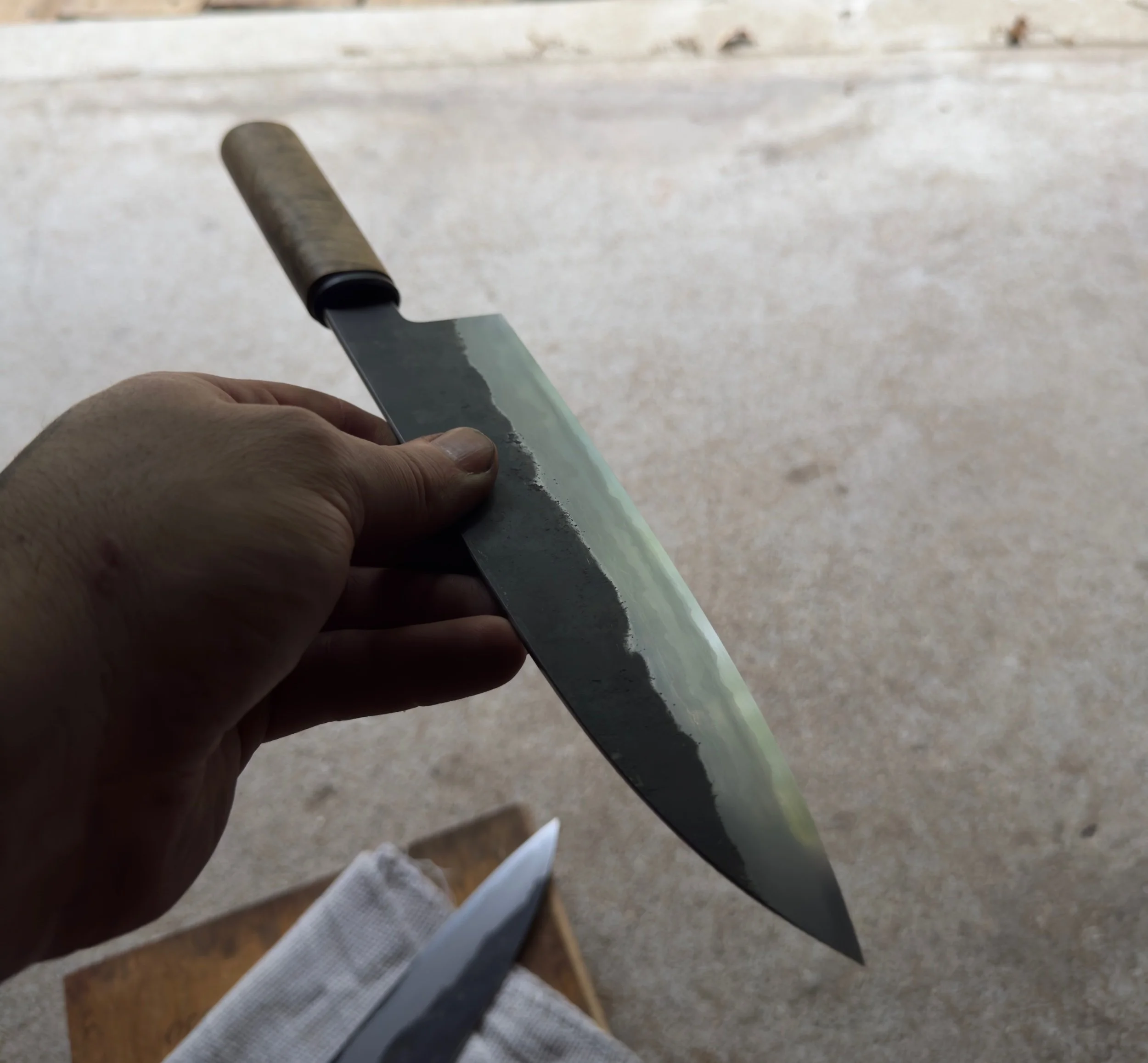 52100 Cladded in layered mild steel, nickel, and one layer of an antique I Beam bracket (I believe 1045). Bevels are stone flattened, satin polished, offset etched and finished with finger stones.